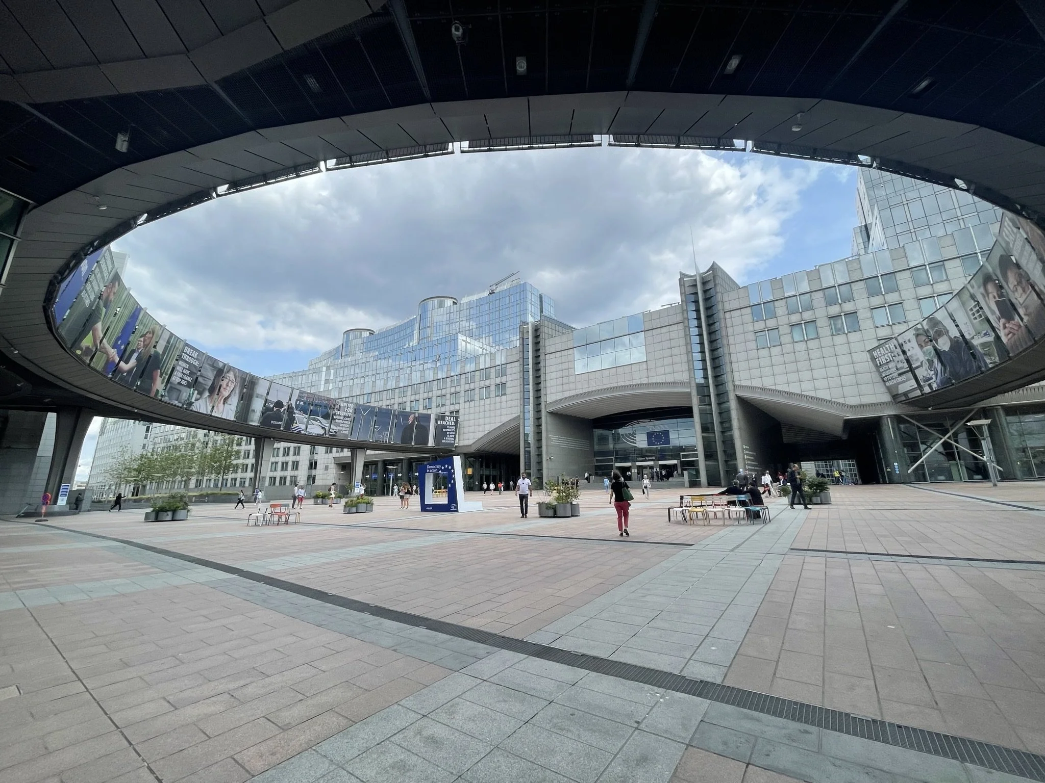 Alışveriş caddesinden Avrupa Birliği Parlamentosu’na gitmeyi hedeflemiştik. Sert esen rüzgar biraz havayı serinletiyordu. Ben çekimlerdeyken her fotoğrafımda sırt çantam görünür. Görenler sorar hep, ne var içinde diye. Zaten herkesin aklına Levent Kırca’nın “tam teçhizatlı kameraman Cevat Kelle” esprisi gelir. Galiba artık alışkanlık olsa gerek sırt çantamda mevsimine göre yedek kıyafetler, yağmurluk, kitaplar, broşürler, kolonyalı mendiller, basit sağlık eşyaları, cep telefonu şarjı, powerbank, su şişeleri ve atıştırmalık kuru meyve vb. bir sürü gerekli gereksiz dolu çantam yine işe yaradı. Yedek gömlek imdada yetişti. (sonraki günler daha serin olacak bazen yedek ince poları da giymek zorunda kalacaktım) havanın kararı belli değil ki bir esiyor serin serin bir duruyor buram buram sıcak. Avrupa Birliği Parlamento yerleşkesine de daha önce gelmiş çekimler yapmıştım. Çekim olacağı için izinler almış yanımızda bize eşlik eden görevliler ile gezmiştik.