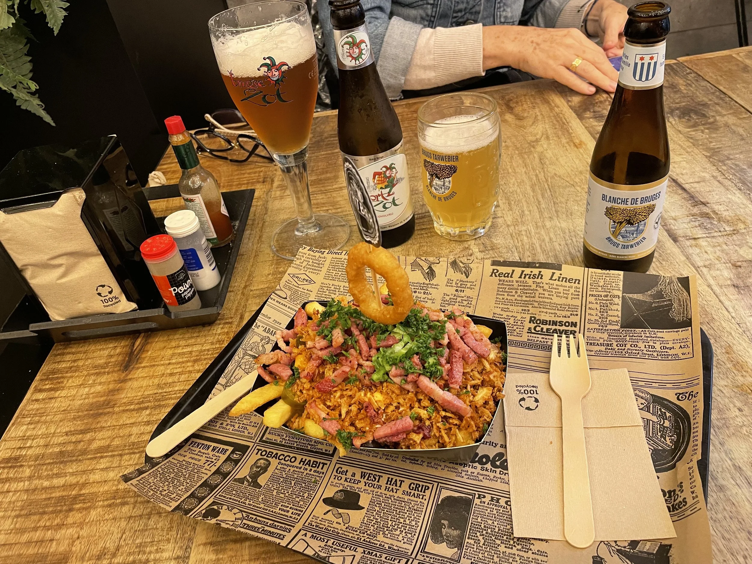 Otelin hemen karşısında hediyelik eşyalar satan bir mağaza var. Tüm alışverişi Brugge’e sakladık. Yük olmasın bize. İçine girip fiyatlar konusunda biraz daha dikkatli incelemeler yapıyoruz. Asıl yarın almamız gerek. O yüzden bugün gözümüze kestirdiğimiz yer olursa aklımızda tutalım istiyoruz. Sabah kahvaltısı için market de var otelin karşısında. Ama kahvaltı-öğle yemeği yapmamız gerek şimdi. İki kadının işlettiği yeri gözümüze kestirdik. Siparişimizi verdik.