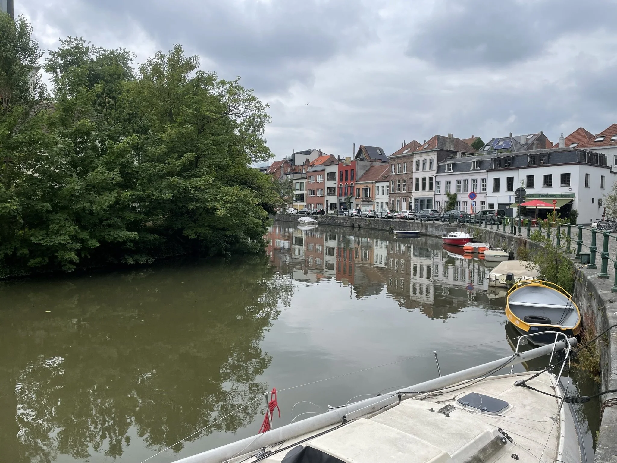 Tarifede yazdığı gibi 49 dakikada Gent’e varıyoruz. İstasyonda inince biraz hayal kırıklığına uğradık. (Anwers‘den sonra normal galiba) Dampoort, şehrin ana tren istasyonu olmadığı için olsa gerek sade bir istasyon. Neyse. Dampoort ten istasyonundan otelimize gideceğiz ama açıkçası Gent dersimi pek çalışamadım. Cep telefonundan toplu ulaşıma bakıyorum. Birkaç tramvay ve otobüs aktarmalı seçenek var. 30-35 dakika yazıyor. Bu defa bulduğum uygun fiyatlı diye seçtiğim otel merkeze ve istasyona 2.5-3 km kadar uzakta. Bir gece nasılsa diye çok üzerinde durmamıştım. Ayşegül’e bakıyorum. Biraz isteksiz olsa da 40-45 dakika yürüme teklifime tamam diyor. Hava çok kapalı. Cep telefonu haritasından otelin yerini da iyice aklıma yazıyorum. Başlıyoruz yürümeye. İki alternatifin kanal kenarından olanını seçiyorum.