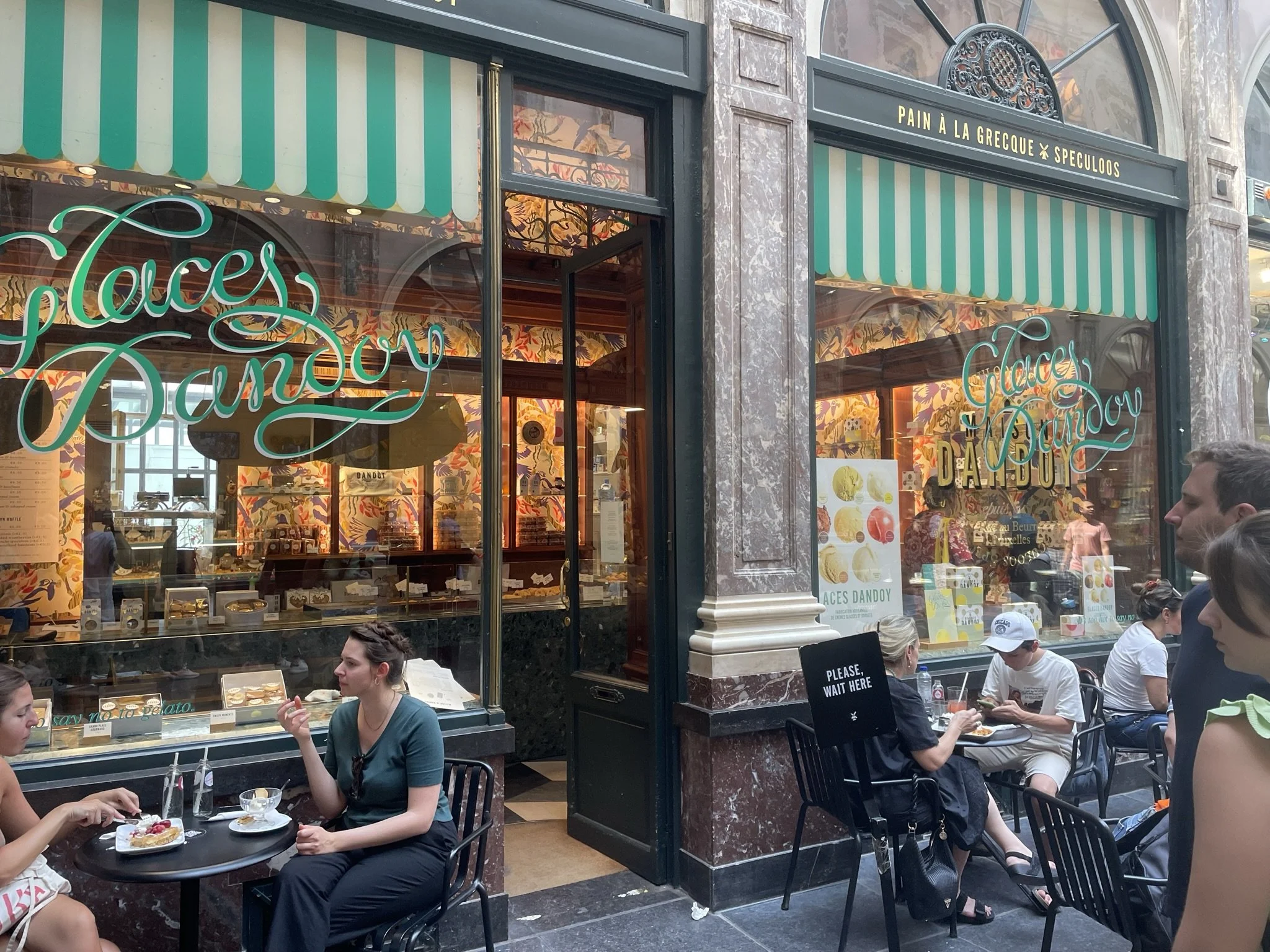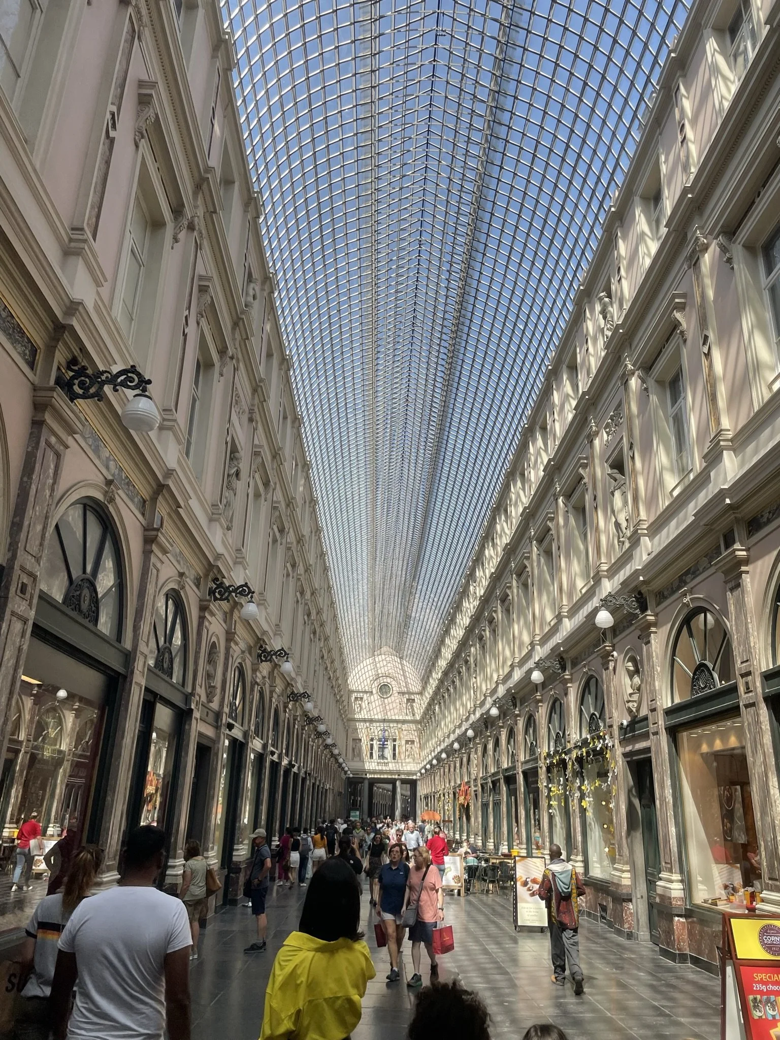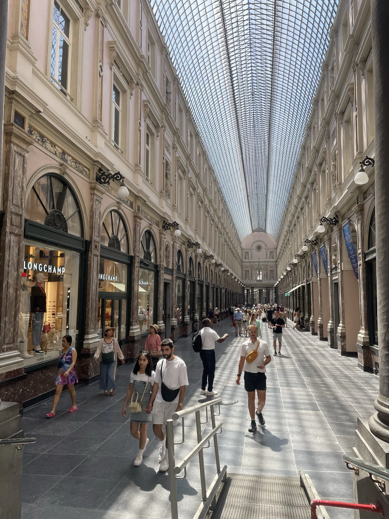 Bu kapalı pasaj içerisinde turistik ama biraz daha kaliteli yerler de var, turistik olmayan ve yerel kaliteli mağazalar da var. Sıradan turistik mekanların dışında bir havası var. Cam tavandan gelen yumuşak ışık mimari detayları ortaya çıkarıyor. Fakat bu estetik yapı içerisinde bir anda dikkatimiz dağılıyor. Ayşegül “Tamam da, benim de canım waffle çekiyor” diyor.