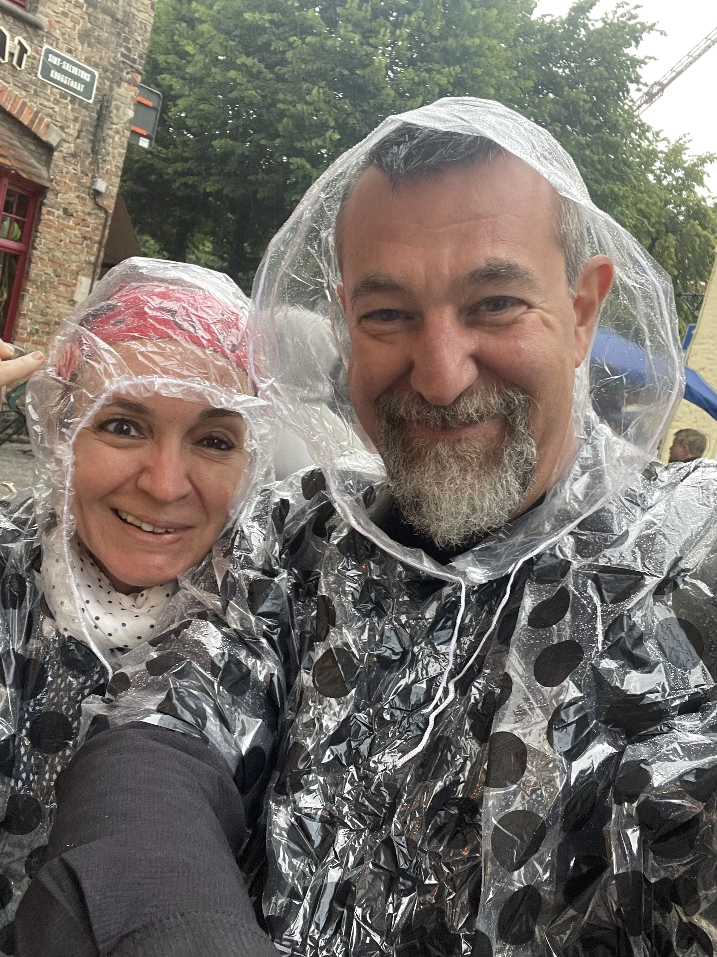 Panço yağmurluklarımızı geçirdik hemen üstümüze, devam. Ayaklarımız ve boş midemiz yine yürütmüyor bizi, illa mola verin diyorlar. Onları kırmadık biz de. Zaten yağmur da hızlandı. Yağmurdan kaçan herkes kafelere restoranlara girmiş. Bizde bir masayı başka ülkeden çiftle paylaşıyoruz.