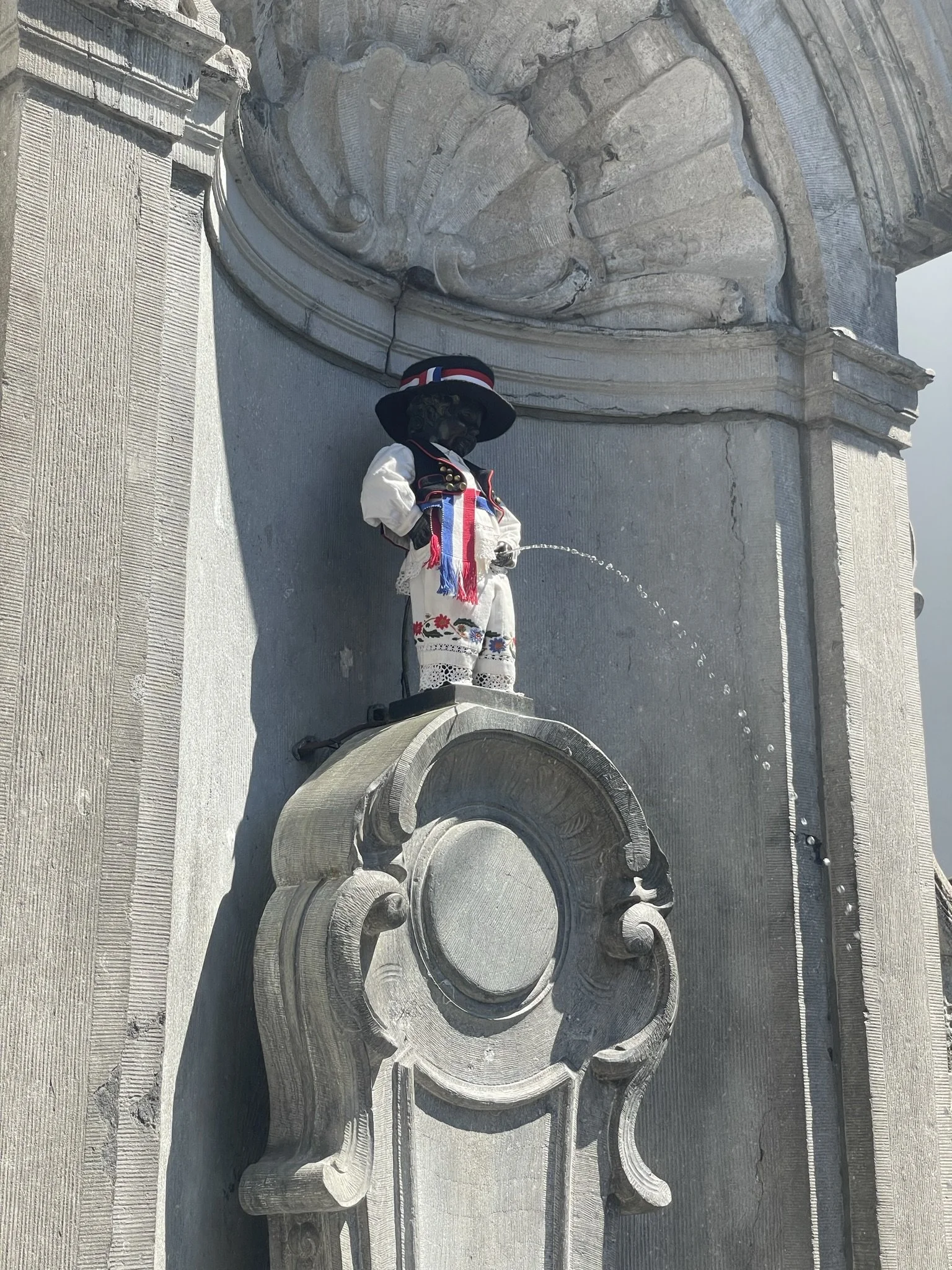Artık meydandan sonra meşhuur “Manneken Pis” yani “İşeyen Çocuk” heykelini görmeye geldi sıra. 60 cm boyu ile bu heykel, tam biz pazarlama objesi. Bir çok defa çalınan heykelin aslı müzede ama kopyası her gün o küçük köşede üzerinde değişik kıyafetler giydirilerek sergileniyor. Biz gittiğimiz gün Hırvatistan milli kıyafetleri ile sergileniyordu. İşeyen Çocuk heykelinin hikayesini siz de kendi Brüksel ziyaretinizde araştırabilirsiniz. Heykelin her gün değişen kıyafet takvimi için internet sitesinden takip edebilirsiniz.