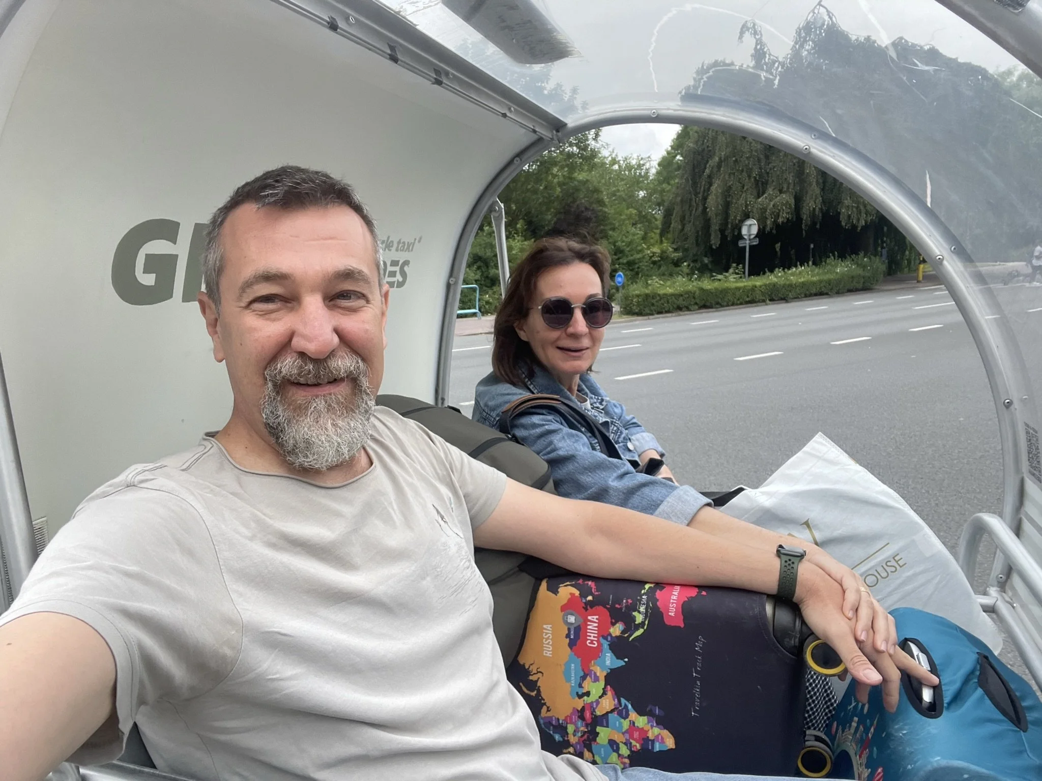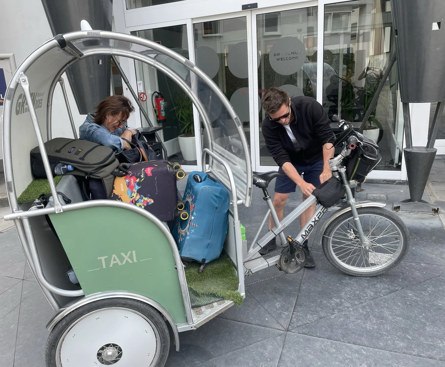 Brugge istasyonu’nunda indiğimizde yine kısa bir keşif gezisi çünkü dönüş günü yine buradan Havaalanına gideceğiz. Otelimiz yine 15-20 dakikalık bir yürüyüş mesafesinde. İstasyonun hemen dışında Sepetli bir elektrikli bisiklet var. Belgesellerde izleriz. Özellikle Uzakdoğu da Tuktuk- çekçek diye benzerleri var. Ayşegül hadi deneyelim diyor. Neden olmasın. Fiyatı da uygun.